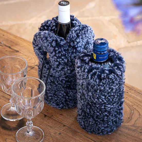 Dieser Schaffell Champagnerkühler von KYWIE hält vorgekühlte Flaschen lange COOL. Die natürlichen isolierenden Eigenschaften der Wolle in Kombination mit der Airlock-Lederkordel um den Flaschenhals halten die Temperatur.